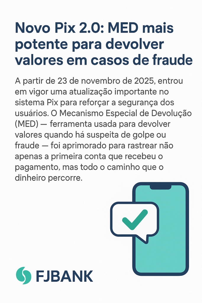 As mudanças no Pix não são apenas técnicas — são uma evolução real para tornar o sistema mais seguro para todos. No FJBANK, enxergamos isso como mais um avanço importante para proteger nossos clientes. Continuaremos investindo em tecnologia, educação e transparência para garantir que você tenha confiança nas suas transações.